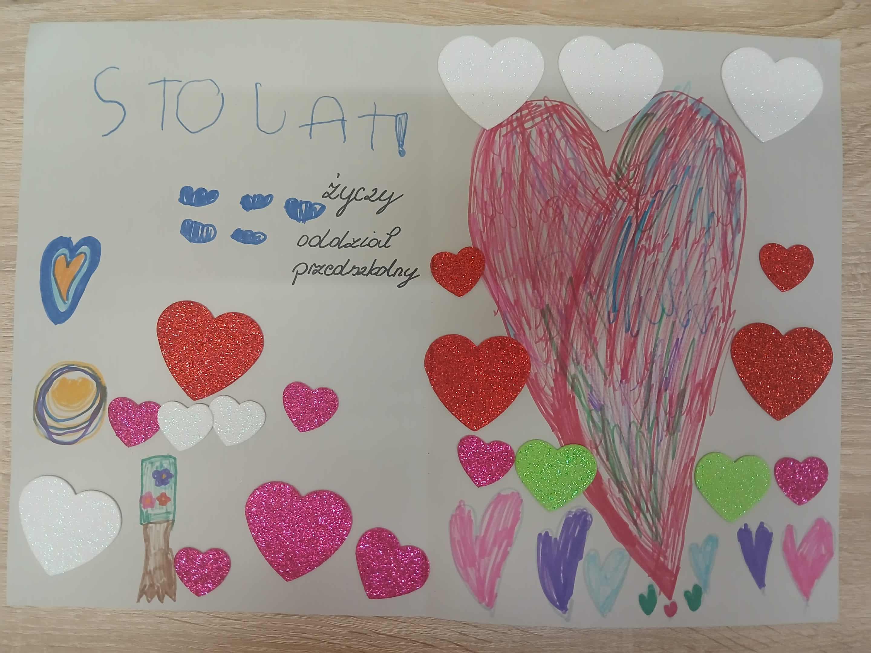 Kartka z życzeniami od naszych przedszkolaków – dla jubilatów z Nowego Radzikowa! (w ramach współpracy międzyszkolnej)