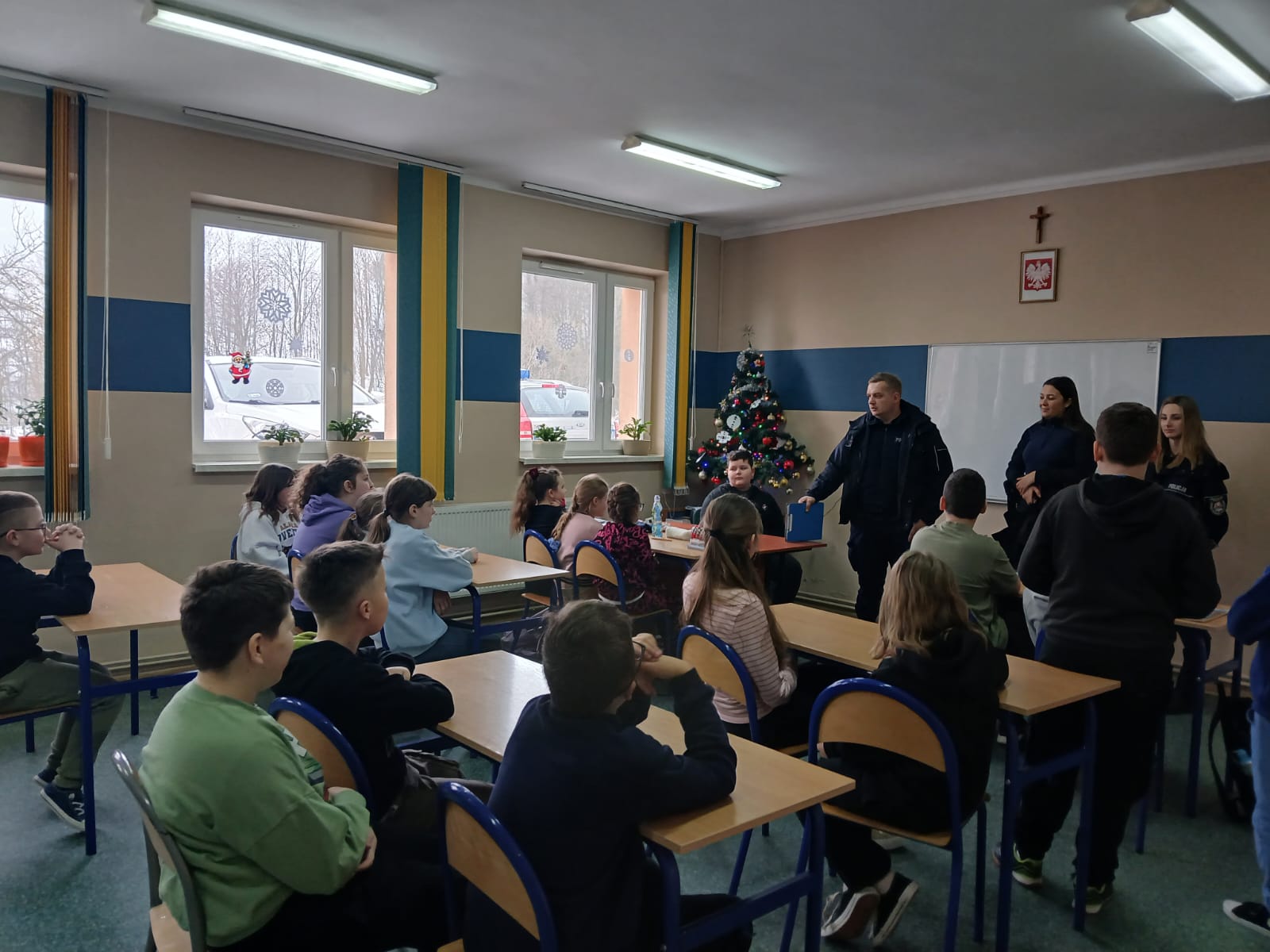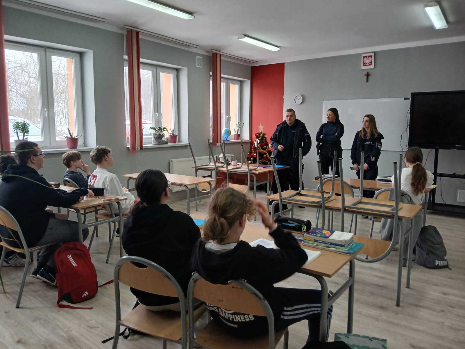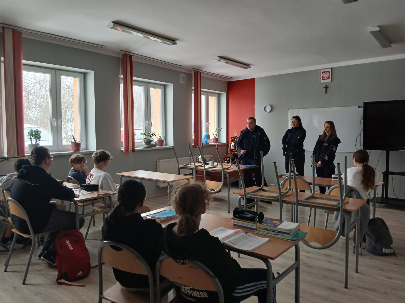 W piątek, 23 stycznia 2026 r., naszą szkołę odwiedzili przedstawiciele Komisariatu Policji w Brzostku. Podczas spotkania omówili zasady bezpiecznego spędzania ferii zimowych oraz znaczenie znajomości i przestrzegania prawa w codziennym życiu. Pogadanka odbyła się w ramach współpracy szkoły z instytucjami dbającymi o bezpieczeństwo dzieci i młodzieży. Uczniowie aktywnie uczestniczyli w rozmowie i chętnie zadawali pytania.