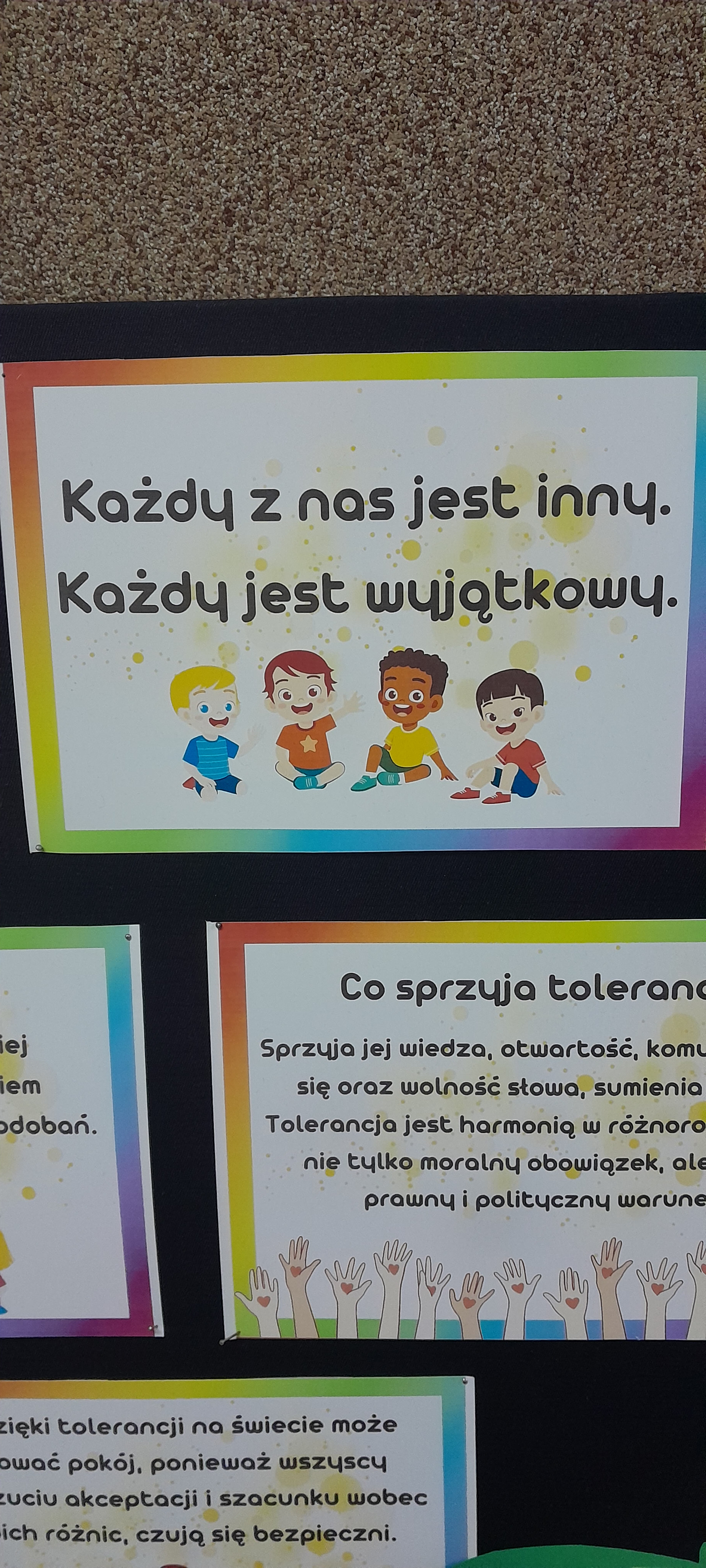 „Każdy z nas jest inny, każdy wyjątkowy” pod takim hasłem odbył się w naszej szkole w dniach od 13.11.2023r do 17.11.2023r kolejny Tydzień Tolerancji. Tydzień ten stał się okazją do refleksji nad własną postawą w odniesieniu do innych osób. Celem inicjatywy było kształtowanie postaw tolerancji, szacunku i empatii. Dzięki inicjatywie udało się stworzyć atmosferę zrozumienia i życzliwości, która – mamy nadzieję – będzie towarzyszyć społeczności szkolnej również na co dzień. Pamiętajmy, jesteśmy różni, lecz równie ważni. Bycie tolerancyjnymi odnoszenie się do drugiego człowieka z szacunkiem nic nas nie kosztuje. Sprawia radość nie tylko nam, ale również osobom, które przebywają w naszym towarzystwie.